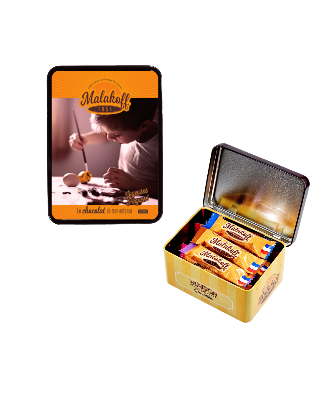 Célébrez Pâques avec élégance grâce à notre mini coffret métal MALAKOFF, édition spéciale Pâques MALAKOFF1855. À l'intérieur, un éventail de nos meilleurs chocolats vous attend : des créations au lait noisettes, au lait feuilletine croustillant, au lait pétillant étonnant, au lait caramel fondant, au noir noisettes riche et au blanc noisettes onctueux. Chaque pièce, confectionnée avec soin dans notre atelier français, est une invitation à redécouvrir le plaisir des chocolats artisanaux, parfaits pour partager ou offrir un moment de douceur lors de cette fête printanière.